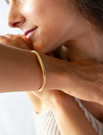Crafted from hypoallergenic 316L stainless steel and coated with 14K recycled gold using advanced PVD technology, this open bangle is designed for daily wear — from coffee to cocktails.